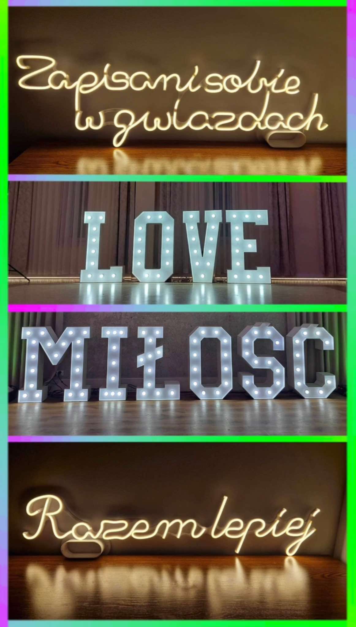 Napisy Neonowe mają około 100 cm szerokości i około 40 cm wysokości.